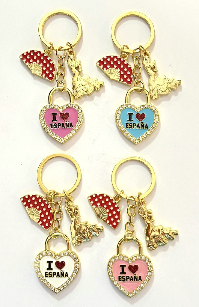 12 llaveros de España con brillantes surtidos en 4 colores.